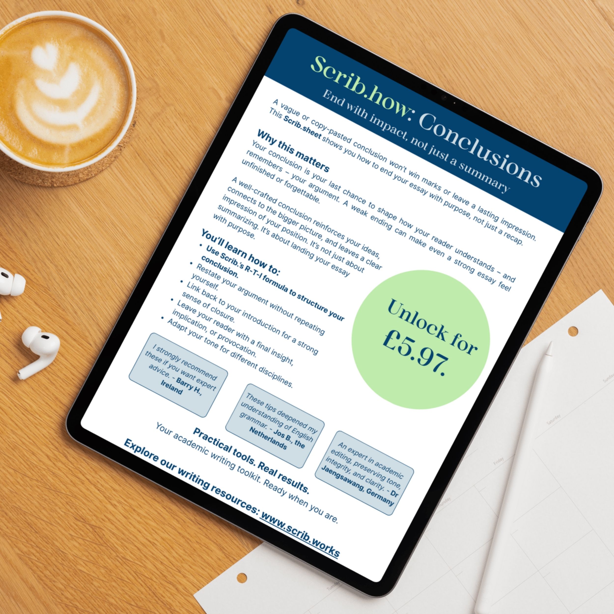 Too many student conclusions just rephrase the introduction. A strong conclusion should show why your argument matters and leave your reader with confidence. This Scrib.sheet gives you practical strategies to end with clarity and authority.